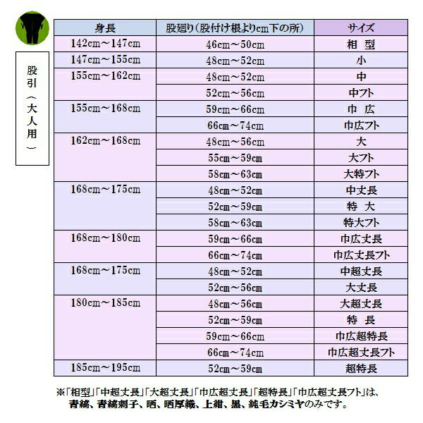 身長と股の付け根より「5cm下」の股廻りを測り、サイズをお選びください。