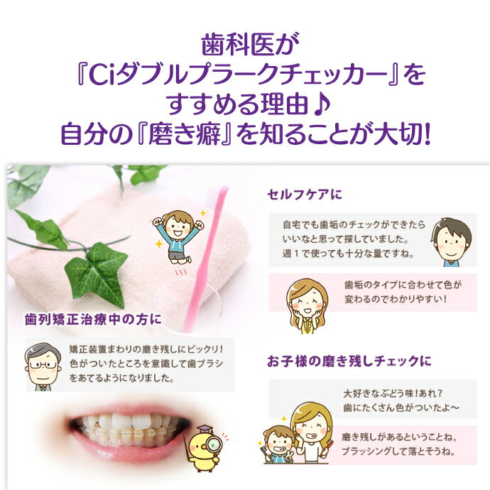 歯に色が付くのでお子様も面白がって、家族みんなで楽しみながら虫歯予防が行えます。