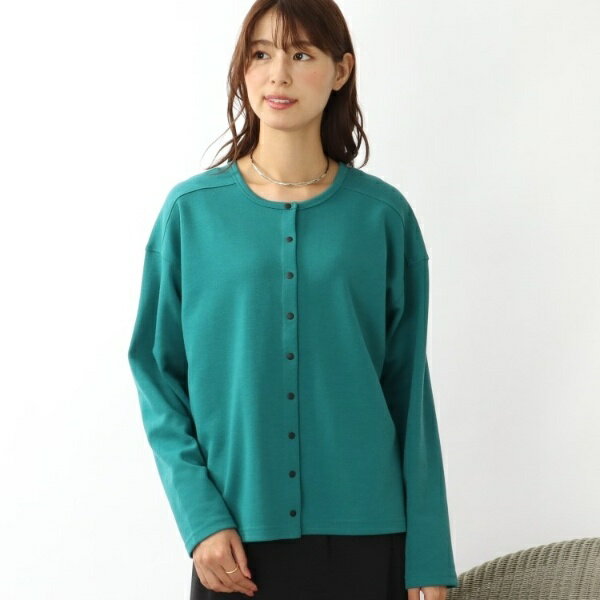 [型番:74135308]‘’ 羽織としても、トップスとしても、前後2wayで着れて自由自在カーデ? ‘’■デザインスナップ釦がさりげないポイントで目を惹き、着脱も楽ちん!ノーカラージャケットのようなきれいめなシルエットながらカットソー素材でカジュアルに着こなして頂ける一枚。